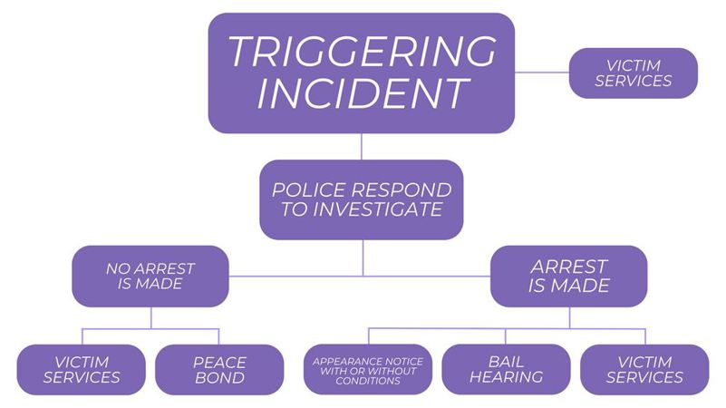 The accused is given a court date to attend to and released on conditions to 'prevent the continuation of the incident. A member of Victim Services will contact the victim shortly after the incident to review the release conditions, offer safety planning, support and referrals.