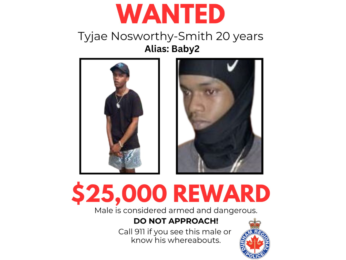 If you know his whereabouts or have had any contact with Tyjae since the murder please call our homicide unit at 905-579-1520 x 5415 or if you would like to remain anonymous, please call crime stoppers at 1-800-222-8477 (TIPS) online at www.durhamregionalcrimestoppers.ca and tipsters may be eligible for a $25,000 cash reward.