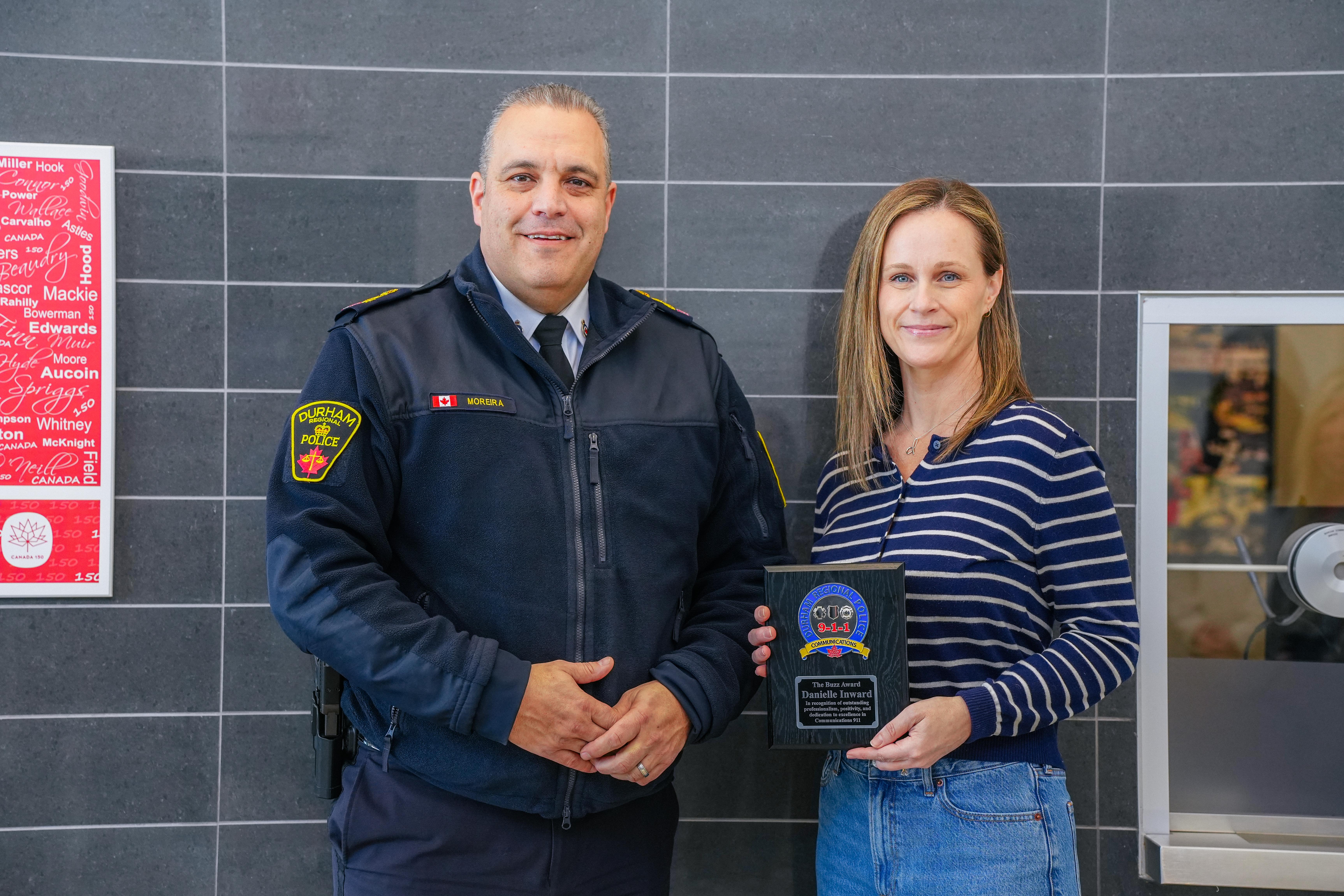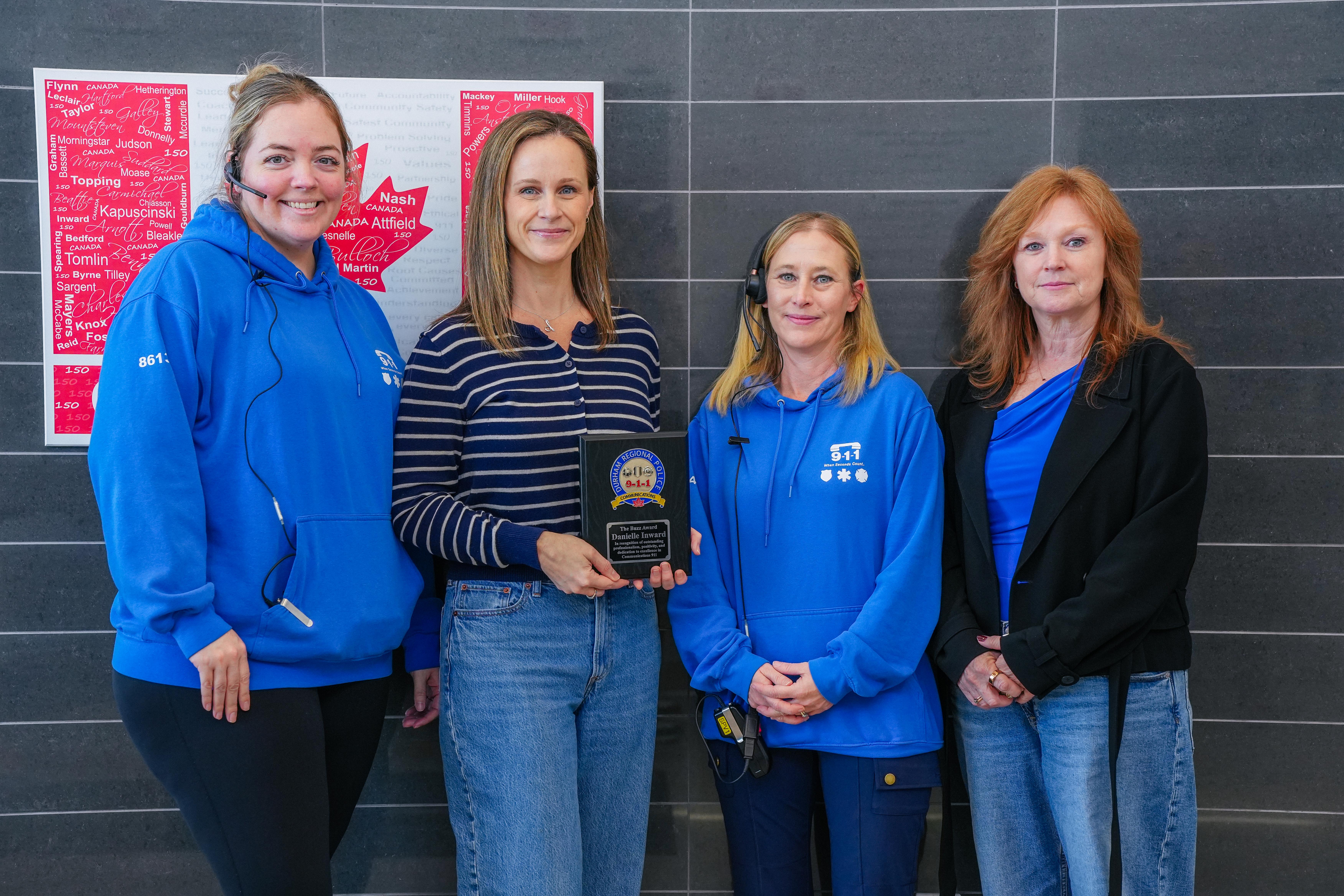 As part of this week of recognition, Chief Peter Moreira presented the 2026 David J. “Buzz” Bezzant Memorial Award to Danielle Inward, a 9‑1‑1 Communicator with the Service since 2016. The peer-nominated award is presented annually to a 9‑1‑1 Communicator in recognition of excellence, outstanding performance, and meaningful contributions to public safety.