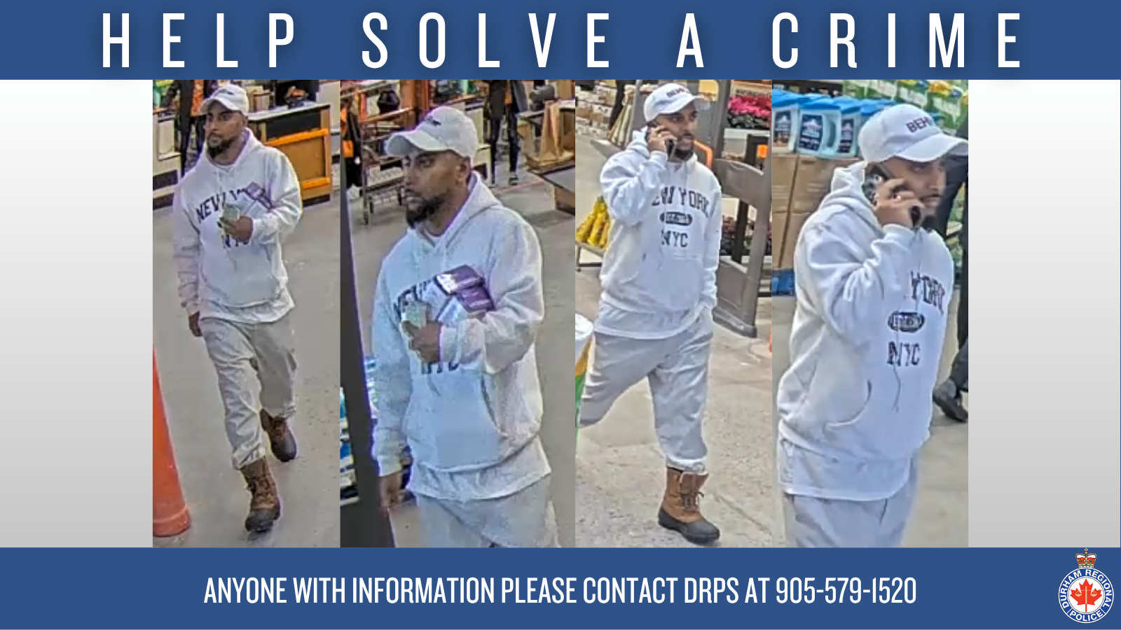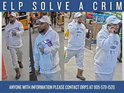 On Saturday, January 17, 2026, at approximately 2:15 p.m., a male attended the Home Depot located at 120 Clarington Boulevard in Bowmanville. The suspect purchased multiple items using counterfeit currency.