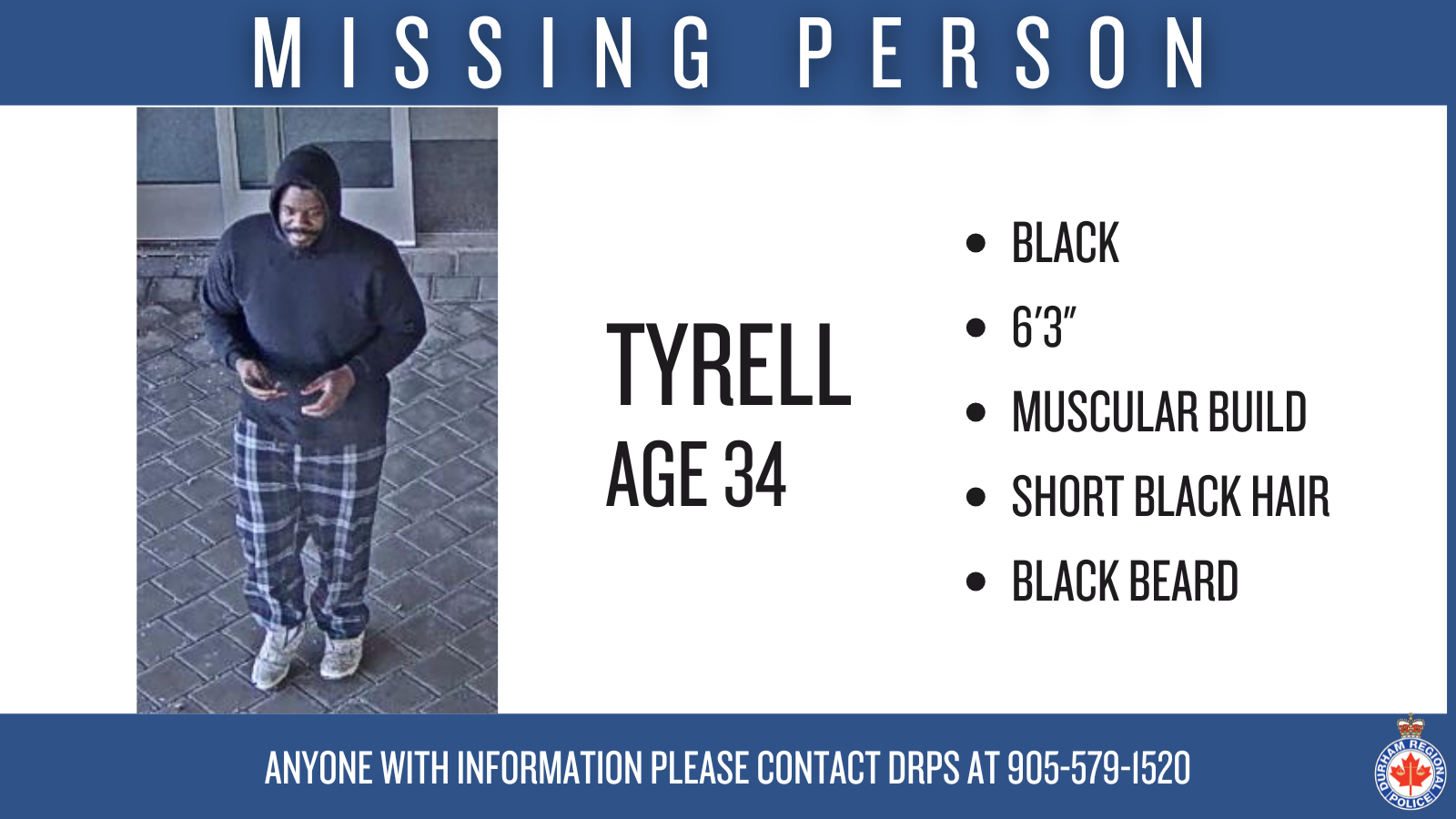 Tyrell is described as: male, Black, 6’3” tall, with a muscular build, and short black hair, and a beard. He was last seen wearing: a black hooded sweatshirt, black/grey plaid pajama pants, and light-coloured running shoes.