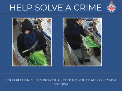 On January, 1, 2025 at approximately 3:40 a.m., members of West Division responded to a theft call at a Circle K located at 460 Bayly Street West, Ajax. The suspect entered the store and walked behind the counter and took several lottery tickets and cigarettes. The suspect demanded the employee open the cash register at which time the suspect proceeded to take a quantity of cash.