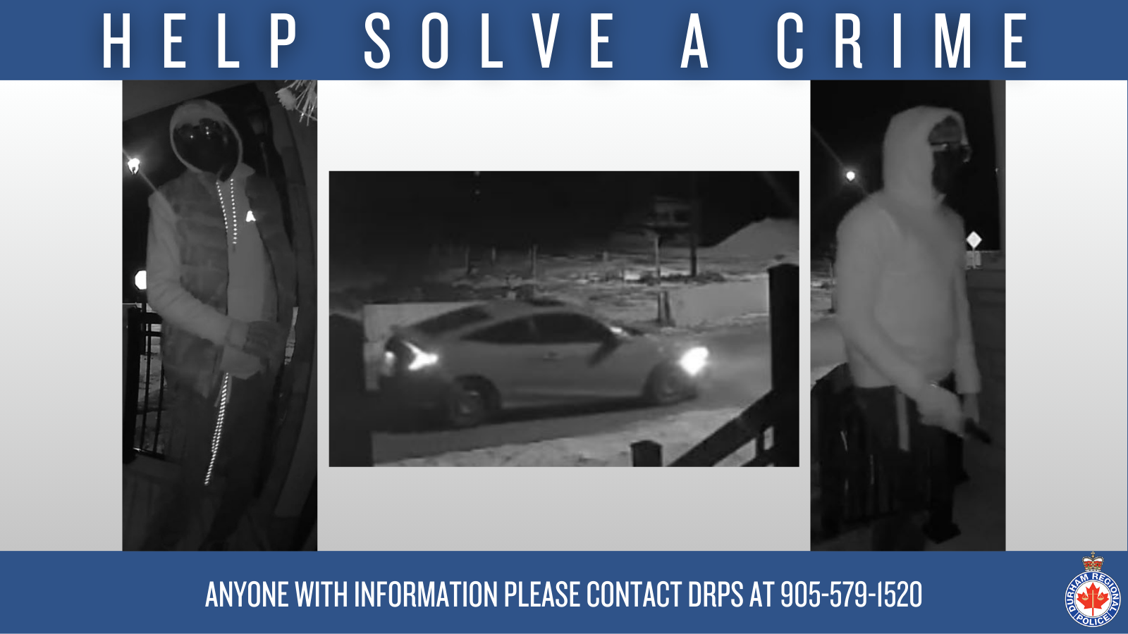 On Tuesday, January 13, 2026, at approximately 3:25 a.m., two males attended the front door of a residence in the area of Turnstone Boulevard and Kerrydale Avenue. The two suspects attempted to break the front door glass to gain entry to the home, but were unsuccessful. The suspects fled to a waiting white Honda Civic sedan being driven by a third suspect, before fleeing the area.
