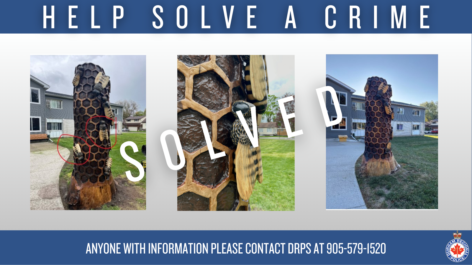 On Tuesday, September 16, 2025, members from Central East Division responded to a theft call at 409 Centre St S, Whitby. Staff with the Town of Whitby reported that an art installation at this location had been damaged, and two wood carved bee’s that were affixed to the sculpture had been sawed off and stolen.