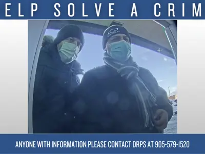 On Saturday, December 13, 2025, at approximately 1:55 p.m., two male suspects attended the TD Bank located at 22 Stevenson Road South in Oshawa. The suspects attempted several transactions using stolen banking information, before successfully withdrawing $1600.00. The suspects were also able to use the banking information to make several transactions at other locations.