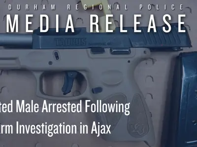 Investigators located the suspect in Ajax and took him into custody without incident. Subsequently, a search warrant was executed at a residence in Ajax, where officers seized a loaded firearm with an overcapacity magazine and ammunition.
